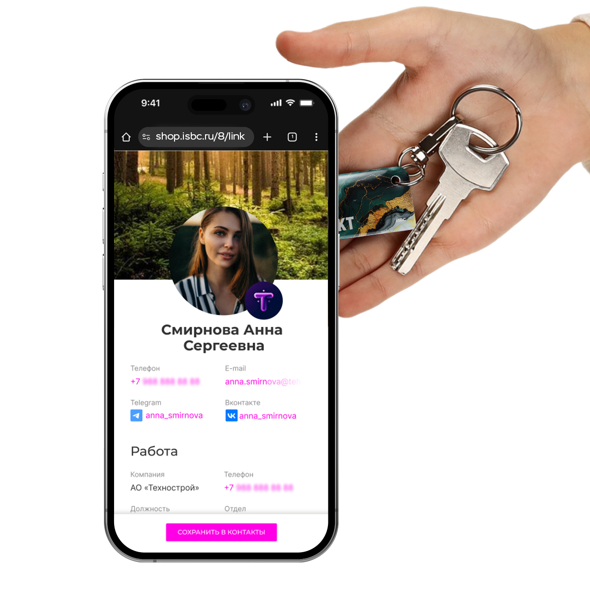Прикоснитесь брелоком к смартфону с NFC, в браузере откроется ссылка на личный кабинет, где вы сможете создать электронную визитку со своими контактными данными. Чтобы передать информацию о себе и своей компании, просто приложите брелок к телефону с функцией NFC. Погрузитесь в мир элегантности с NFC-визиткой «Зеленый мрамор».