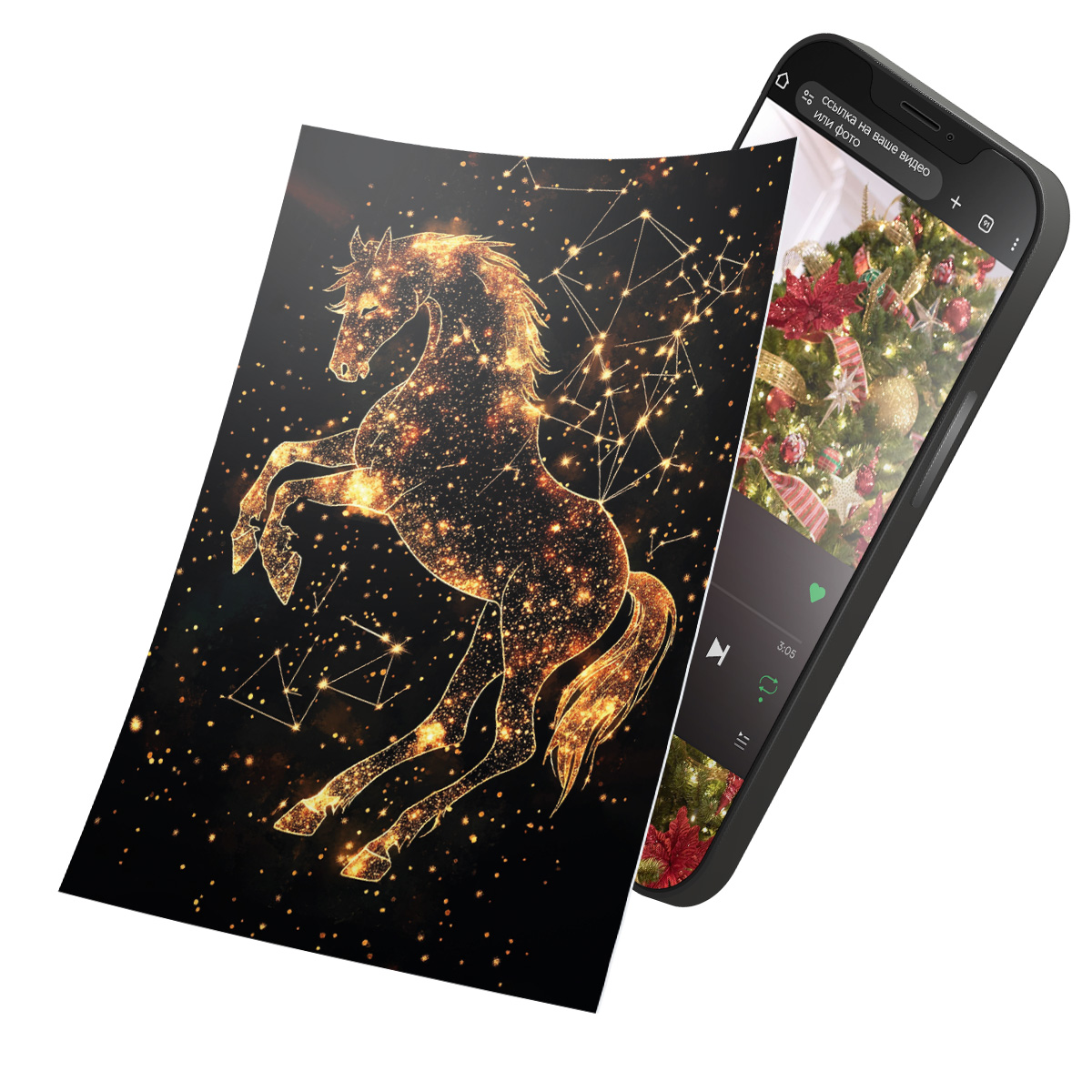 Подарите волшебство на Новый год с эксклюзивной интерактивной открыткой ISBC "Символ года; Космический гость Нового года"! Стильный дизайн с сияющим силуэтом космического коня и мерцающими звёздами создает атмосферу праздника и загадки.