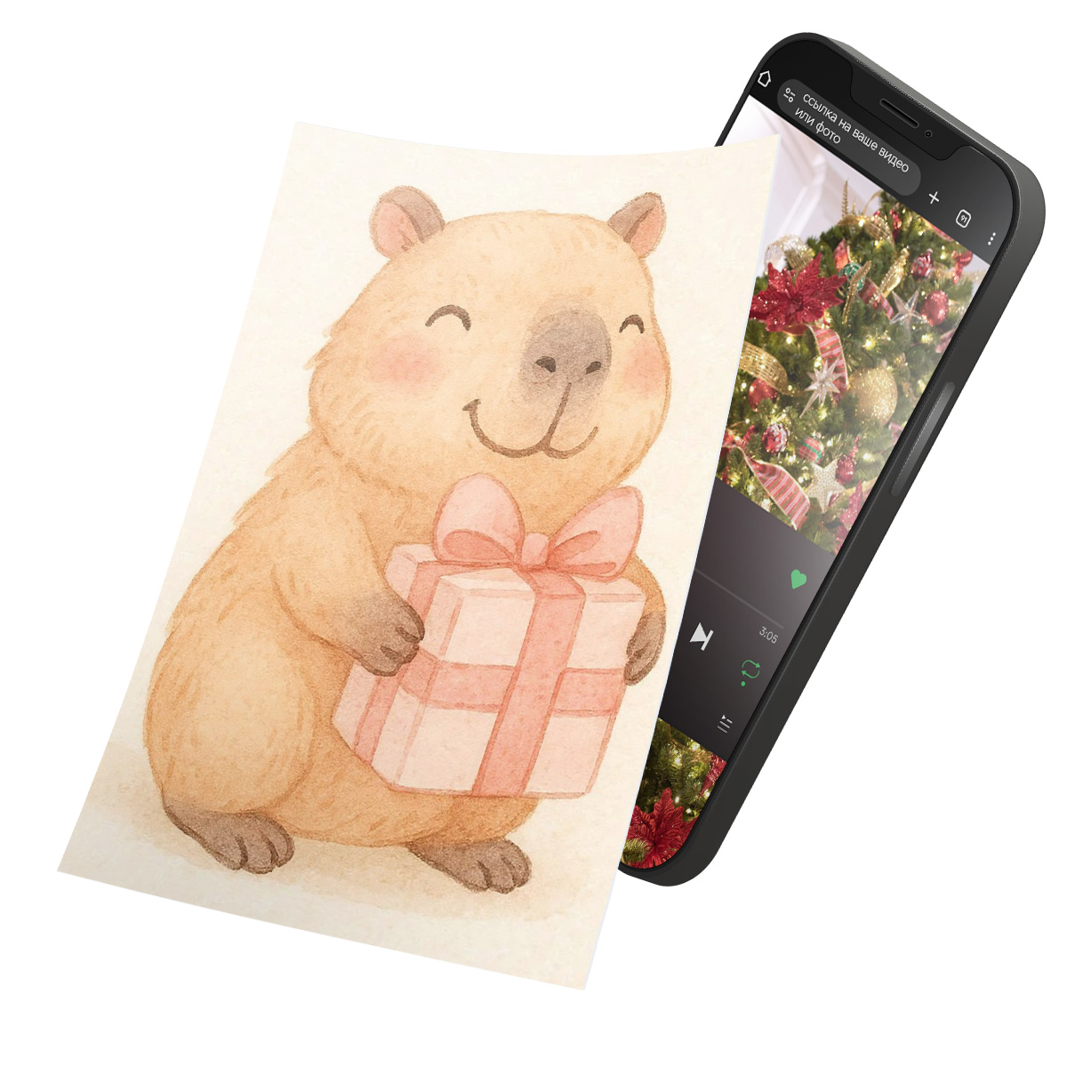 Подарите волшебство вместе с интерактивной открыткой "Новогодние зверушки; Капибара"! Милый капибара с праздничным подарком на мягком акварельном фоне создаёт уютную, сказочную атмосферу. Встроенный NFC-чип моментально превращает обычное поздравление в цифровой сюрприз: просто приложите смартфон и откройте персональное видео, письмо или пожелание.