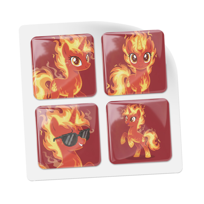 В каждом комплекте – четыре неповторимых огненных единорога: кто-то уверенно шагает вперёд, кто-то улыбчиво демонстрирует стильные очки. Такие герои станут идеальным украшением для блокнотов, смартфонов, ноутбуков или подарочных упаковок.