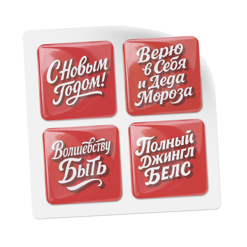 Каждый стикер изготовлен из высококачественной эпоксидной смолы, благодаря чему они не только красиво блестят, но и приятно ощущаются на ощупь. В комплекте четыре стильных наклейки, которые поднимут настроение всем вокруг: "С Новым годом!", "Верю в себя и Деда Мороза", "Волшебству быть" и "Полный Джингл Белс". Ярко-красный фон и объемные буквы создают эффект настоящего праздничного декора.