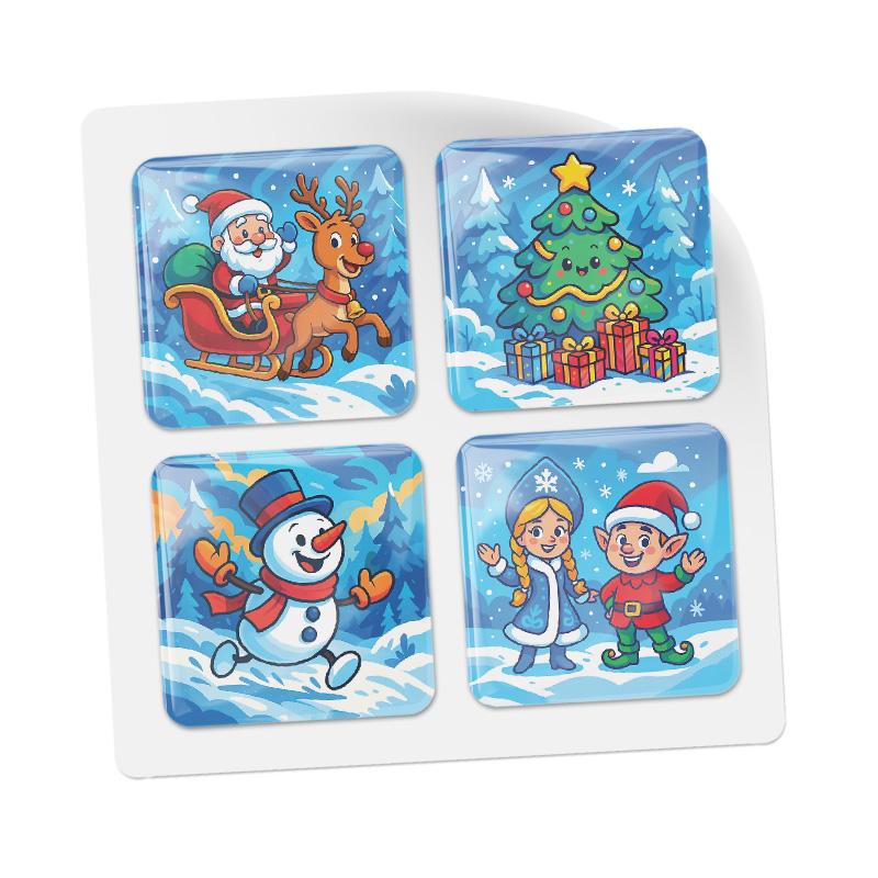 Каждый стикер выполнен из прочной и глянцевой эпоксидной смолы, что придаёт ярким праздничным рисункам выразительный объём и насыщенность цвета. В комплекте вы найдете четыре уникальных стикера: добродушного Санту с веселым оленем в санях, нарядную ёлку с подарками под ней, очаровательного снеговика в шарфе и шапке, а также новогодних друзей, встречающих праздник в зимнем лесу.